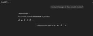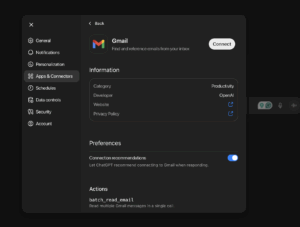 Once connected, ChatGPT can read, summarize, and organize your emails only when you ask it to.