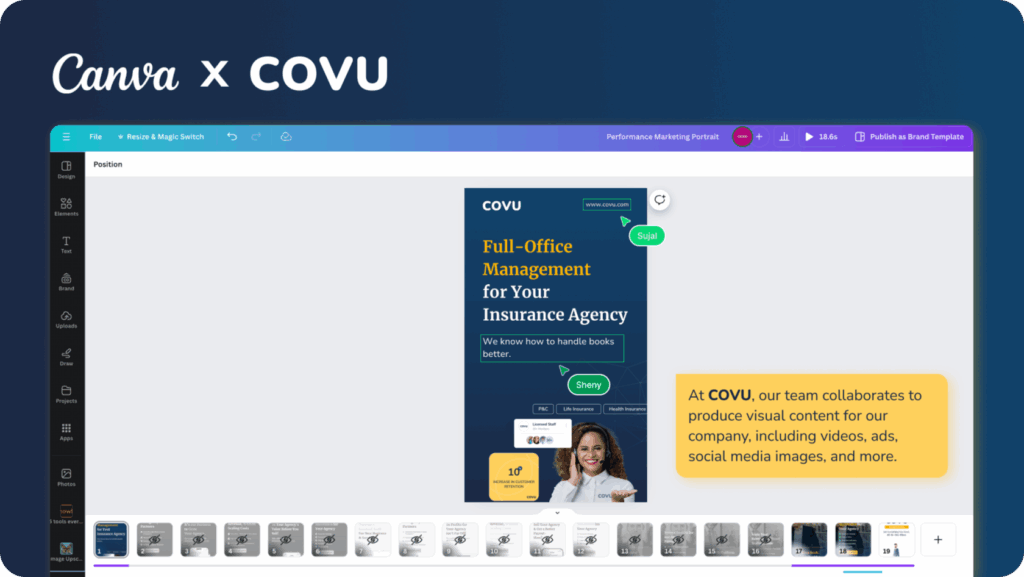 Marketing Materials: Insurance agencies can leverage Canva to create visually appealing marketing materials that attract and engage potential clients.