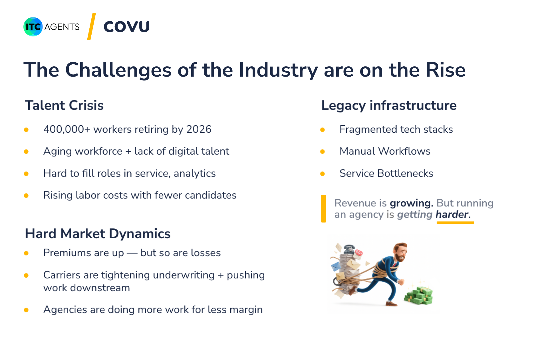 At the same time, many of the private large roll-up brokerages are heavily leveraged, trying to modernize while carrying complex legacy systems and cultures. The result is a system stretched thin, looking for efficiency and leverage.
